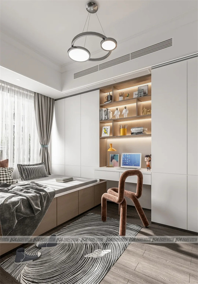 兒童房采用現代化的榻榻米+書桌+衣柜的一體化多功能設計,既能滿足孩子休息、學習、娛樂及收納的基本要求,又保持了整體風格的一致,美觀實用。