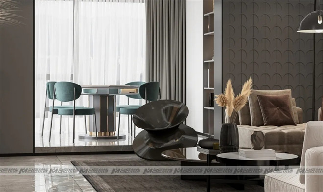 別具一格的客廳設計,突破以往設計的傳統界限,構筑了一個大方而獨特的空間。沙發背景墻采用帶有立體感的深灰色硬包拼接白色墻面,咖色絲絨沙發拼接白色布藝沙發與之銜接,在不同材質的碰撞下,明與暗的對比下,達到空間錯落有致的視覺感以及層次感。壁爐里的熊熊火焰,讓身心與視覺融起暖意。想象在寒冷的冬日里,在火光的映照下,與家人看一部電影,聽時光緩慢流淌的聲音,這該是多么享受的事情。