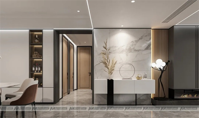 設計師巧妙的布置一組白色的玄關柜,擺上極具藝術感與美感的現代擺件作為裝飾,金銀交匯,空間精致感迎面而來,讓人迫不及待地想入室一探究竟!