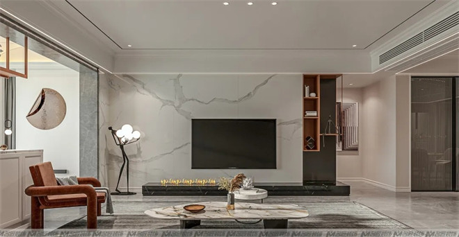 客廳空間簡潔大方,米灰色的布藝沙發散發著溫馨的味道,三色抱枕點綴其中,并與地毯、毛毯、單人椅的顏色相呼應,隨意又充滿設計感。大理石材質的電視背景墻及茶幾,帶來輕奢質感的視覺享受,提升空間的檔次。