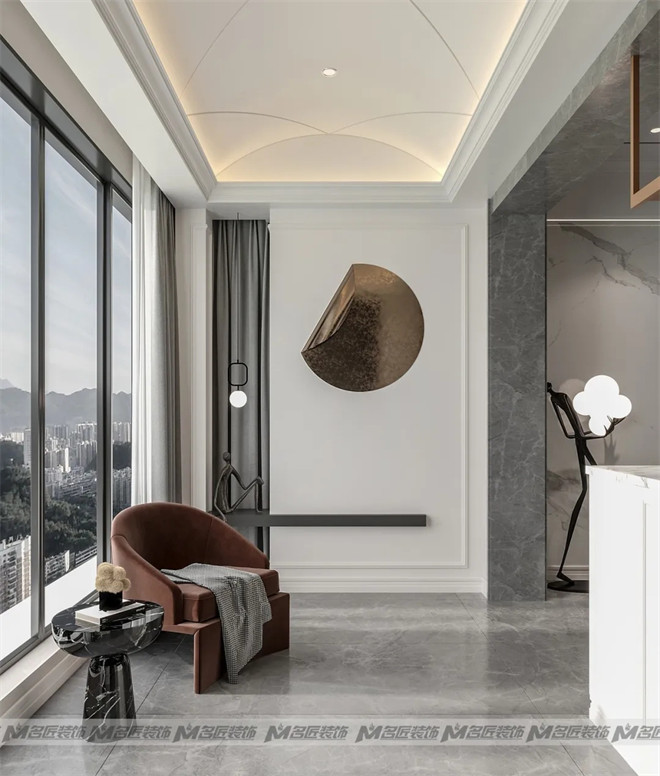 高級感的玄關設計,以白色和灰色作為主要基調,利用富有創意的金屬掛件及黑色抽象雕塑豐富空間,在極簡的吊燈襯托之下描摹出優雅的格調。