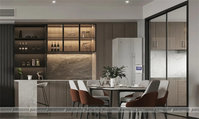客餐廳一體化設(shè)計(jì)讓空間看起來(lái)簡(jiǎn)約大氣,也增加了家人們的互動(dòng)感,餐邊柜搭配小吧臺(tái),形成一個(gè)功能緩沖區(qū),兼具實(shí)用及美觀