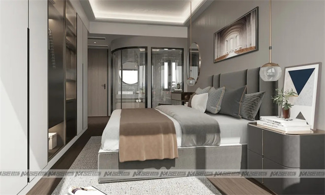 主臥低飽和的配色方式,再輔以金屬色的軟裝點(diǎn)綴,賦予空間深邃感及和諧感,宜家更宜居,還有一個(gè)亮點(diǎn)是全玻璃的衛(wèi)生間設(shè)計(jì),既節(jié)省空間又增加透光度,采用玻璃隔斷將沐浴區(qū)與梳洗區(qū)、如廁區(qū)分開(kāi),做好干濕分離