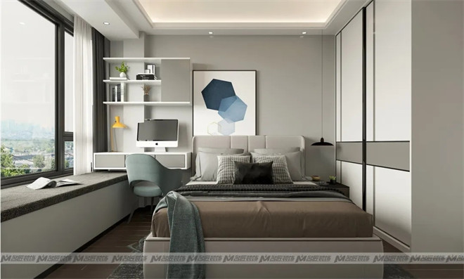 次臥的設(shè)計(jì)相比于主臥多了一分簡(jiǎn)練,同樣低飽和的色彩搭配下增加了更多白色,讓人置身其中感受到輕松自然的氛圍