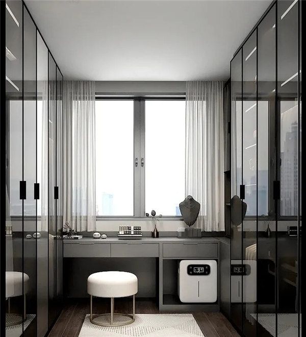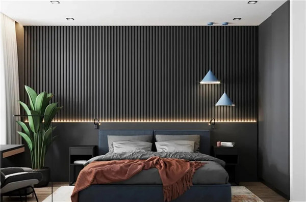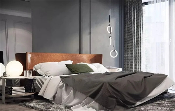 臥室空間整體采用黑灰色調搭配木質地板,穩重,大氣,卻又不失品味,有令人眼前一亮的感覺。