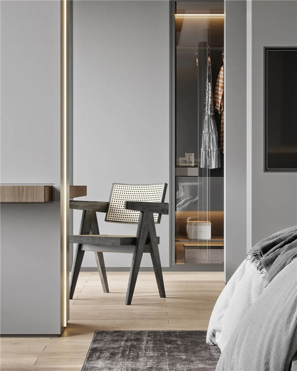 主臥無主燈設計,局部分散的照明,不僅實用還讓客廳更有層次感與格調,放棄復雜造型的吊頂,使用隱藏筒燈和臺燈寬敞大方。臺燈散發出的柔和燈光,的與空間色調完美融合,散發著柔和光芒,輕奢而不張揚。