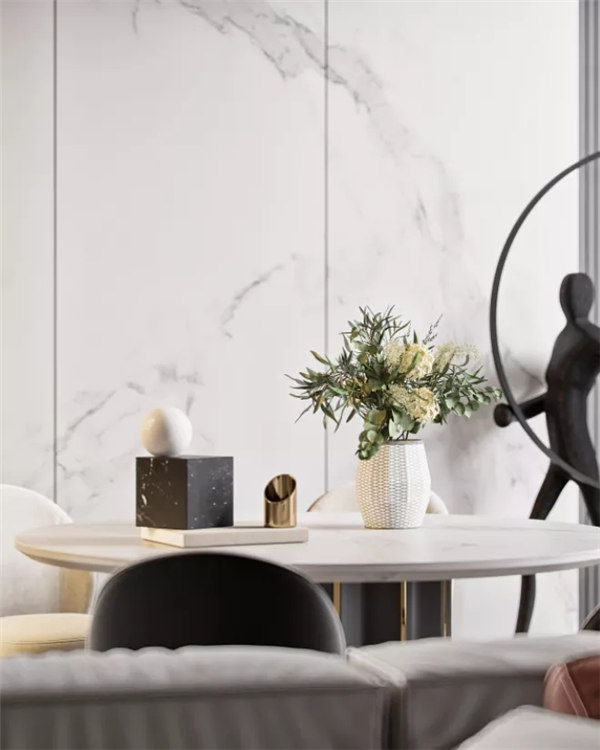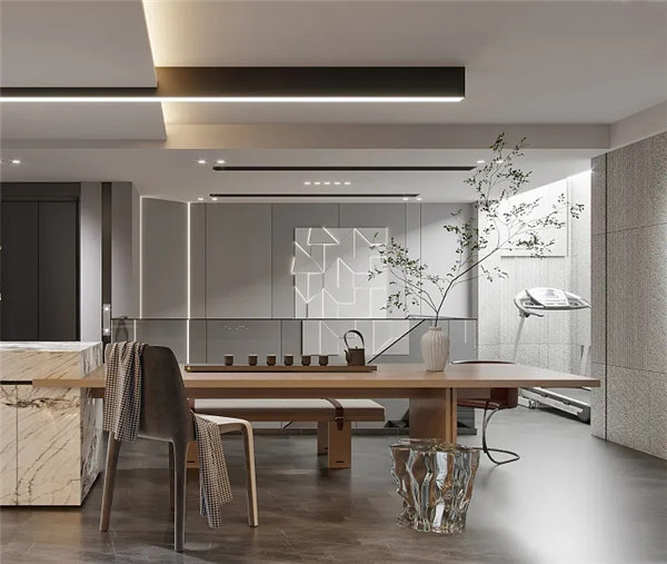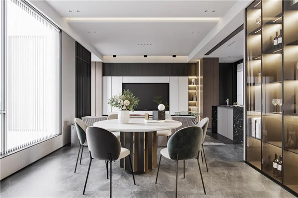 餐廳色調個性,以灰色餐椅搭配米白色坐墊,白色大理石臺面,搭配無主燈,與客廳遙呼相應。撞色設計與線條交錯有致,讓空間顯得飽滿,富有層次。不張揚的奢華才是兼顧生活品質與卓越風范的展現。