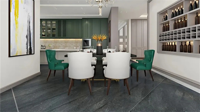 開(kāi)放式廚房大面積運(yùn)用墨綠色,與客餐的軟裝搭配好不違和,讓空間氛圍更加多元化,摒棄了過(guò)多的約束,擺脫了沉悶的裝修格局,讓空間更加開(kāi)放。