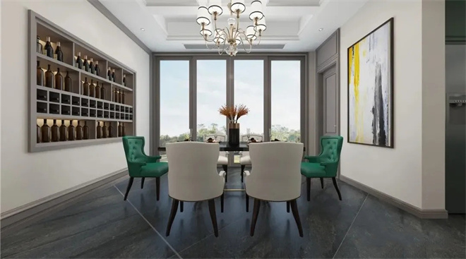 餐廳布局排列有序,用金屬質(zhì)感等元素來(lái)提升空間的奢華,這里不只是生活用餐的需要,還是家人交流之地。跳躍綠色餐椅,搭配古典特色的吊燈,給空間帶來(lái)視覺(jué)上的層次感,明亮黃色裝飾畫活躍氣氛,讓用餐變成一件愉快卻又優(yōu)雅的事。