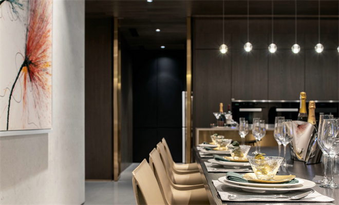 墻上藝術(shù)畫作的鮮明色調(diào)創(chuàng)造視覺焦點(diǎn),讓人在用餐間隙中也可欣賞到藝術(shù)的精彩。局部結(jié)合金色的跳躍,體現(xiàn)藝術(shù)時(shí)尚之余又不失溫馨休閑的感覺。